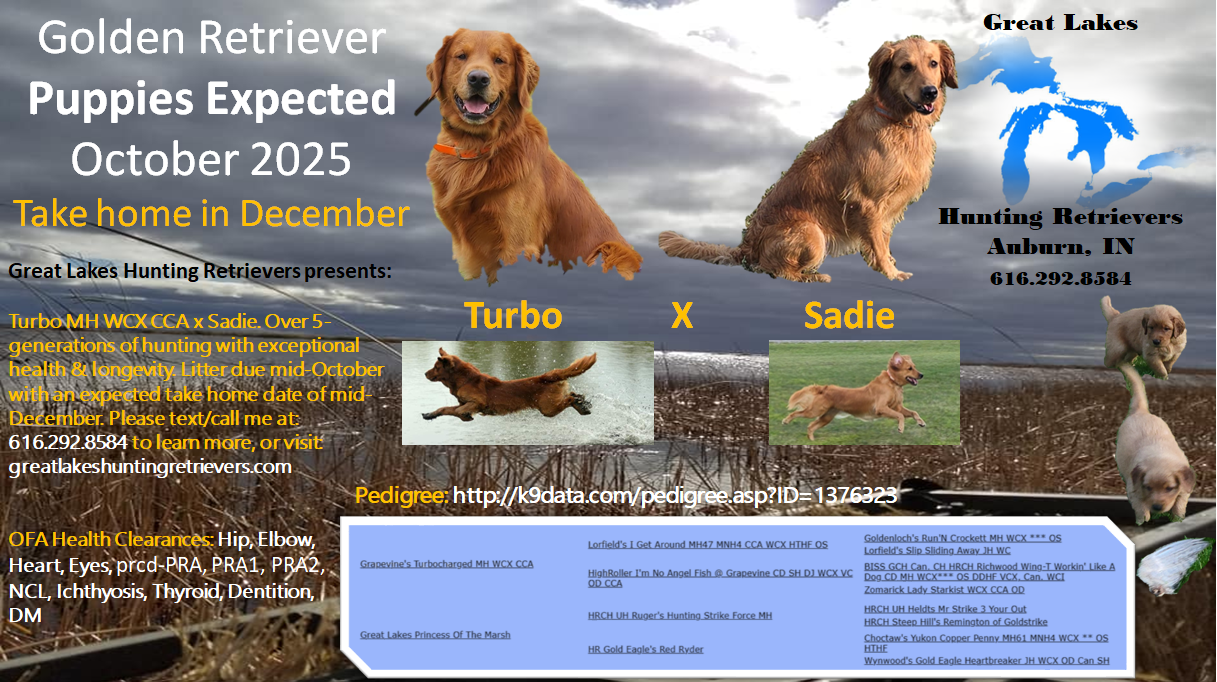 We are taking deposits on reservations for a Turbo x Sadie puppy. If you’re interested and want to learn more, please email me at: Great.Lakes.Hunting.Retrievers@gmail.com or call/text me at: 616-292-8584.